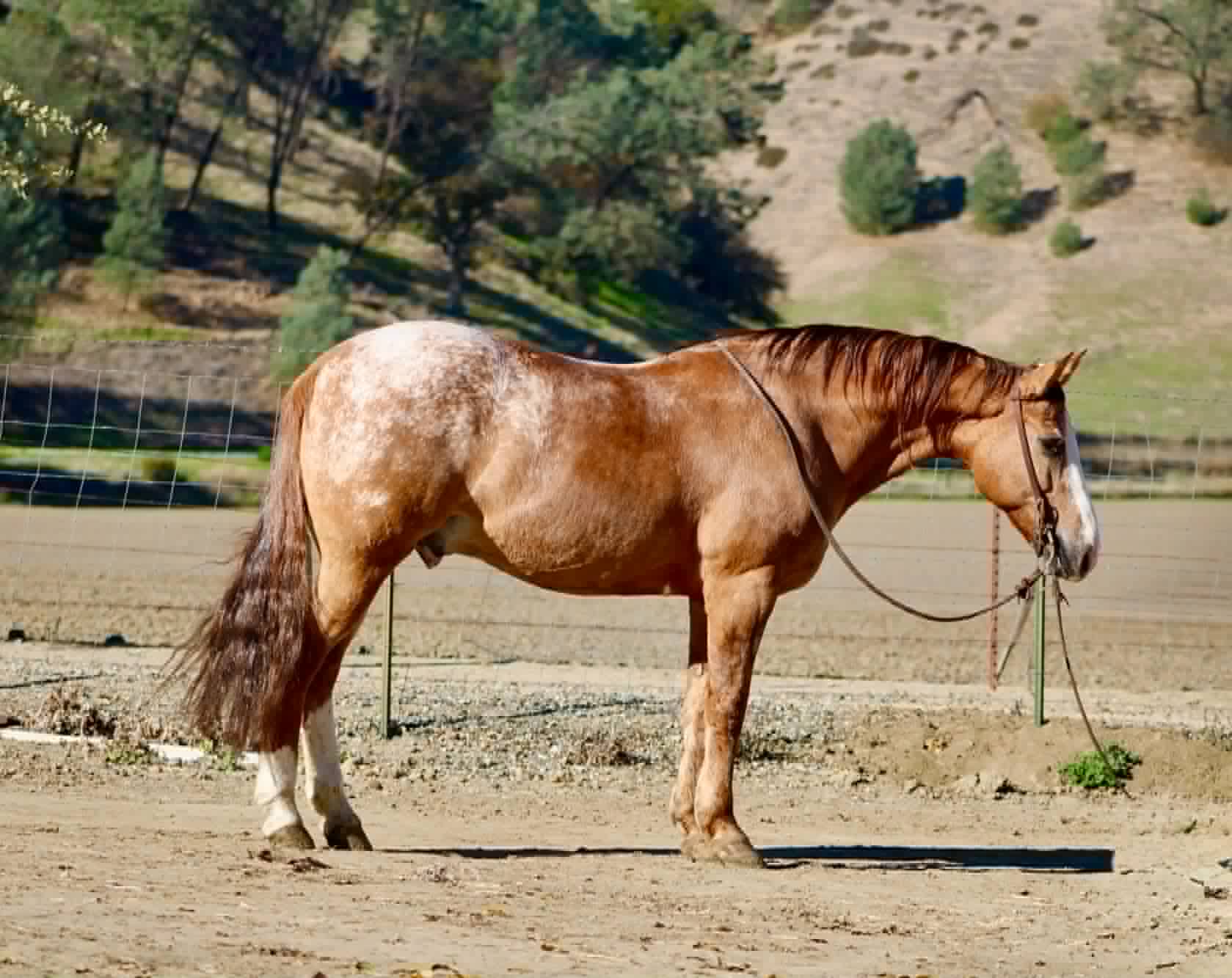 You could line up a hundred geldings and still spot this one first. Applewood is a standout — a striking dun blanket Appaloosa with tiger stripes on his legs and a look that flat gets attention.